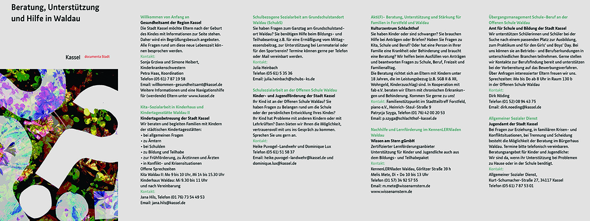 Ein neuer Flyer Beratung, Unterstützung und Hilfe in Waldau liegt für den Stadtteil Waldau vor. In ihm werden die vielfältigen und zahlreichen Unterstützungsangebote unterschiedlicher Träger im Waldau knapp und konkret vorgestellt. Eine flächendeckende Verteilung an die Familien ist bereits erfolgt. Weitere Flyer liegen in der Stadtteil- und Schulbibliothek Waldau, im Stadtteilbüro Waldau, KennenLernladen und Café Schnuckewerk zum Mitnehmen bereit.