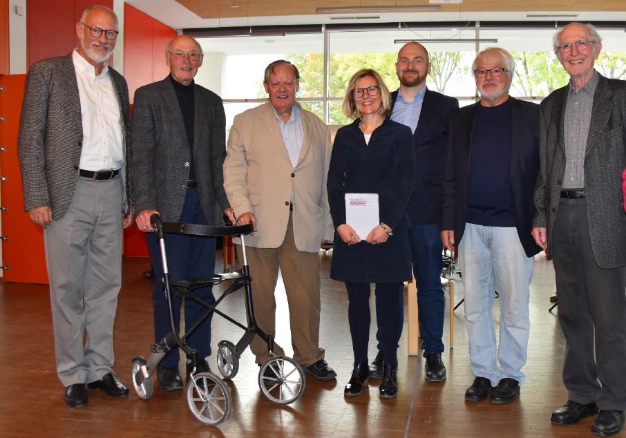 Gruppenbild mit Dame: Prof. Messner umrahmt von aktuellen Mitgliedern der Schulleitung (T. Seibel, P. Dreher) und grauen Herren; links. G. Vater, D. Grobe, rechts R. Otto und Dr. K. Lindemann.