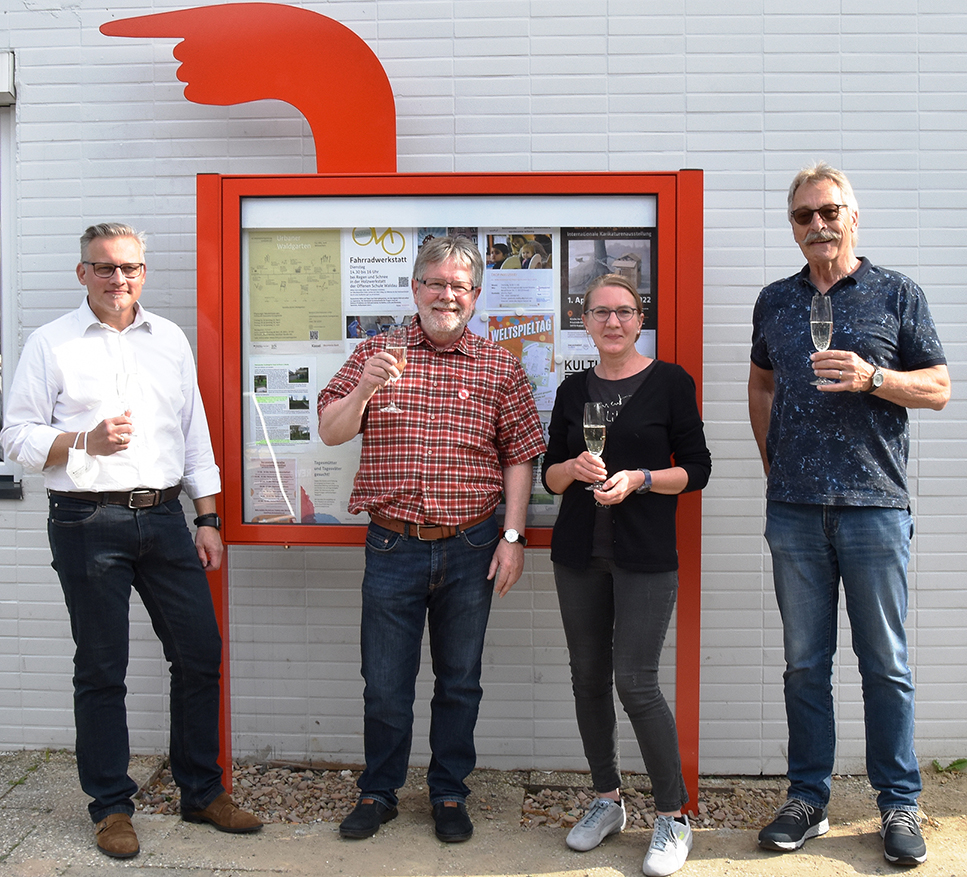 Über den neuen Schaukasten der ARGE Waldau freuen sich der alte und neue Ortsvorsteher D. Seeger und J. Bonn, jeweils außen, sowie J. Blutte für die ARGE und A. Waldschlägel (v.l.n.r.) für das Stadtteilbüro Waldau.